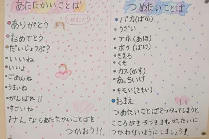 毎日の給食の時間には、「いじめを許さない合言葉」を紹介する放送を毎日しています。
