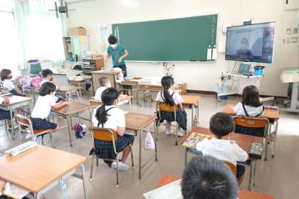 今日の朝会は、校長室と各教室と結んで、オンラインで行いました。
