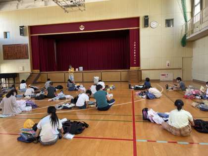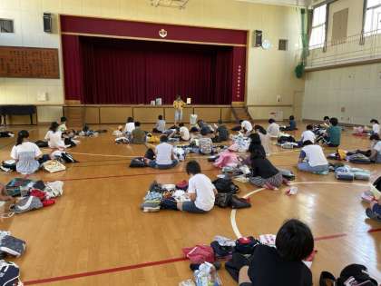 朝8時30分より、5・6年生の林間指導の荷物点検を行いました。