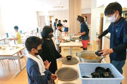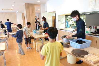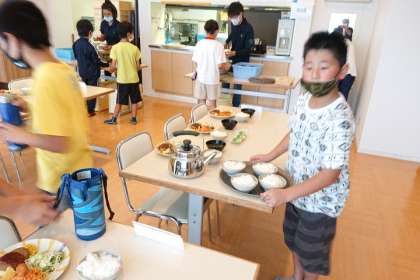 入浴をすませ、食事係が夕食の準備をしています。