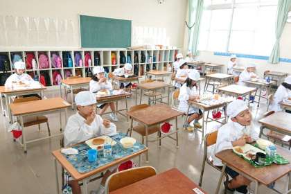 2つの教室に分かれますが、子どもたちはがんばって準備し、静かに給食を食べていました。