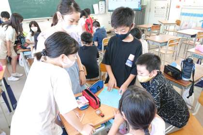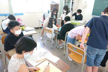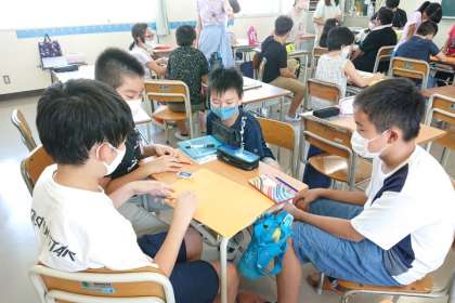 新しい当番のメンバーが集まって相談をしながら、当番の名前、仕事の内容、メンバーなど、当番の札を書いています。