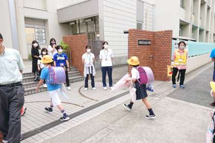 「あいさつ運動」の3人の子どもたちは、昨日に引き続き、今日も正門に立っていました。