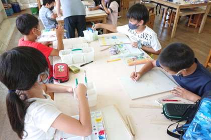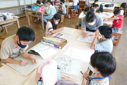 板材に下絵をかきながら、交代でのこぎりの使い方を学んでいます。