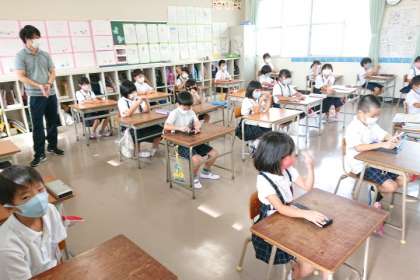 教室と校長室を結んでオンラインで児童朝会を行いました。
