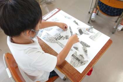 画用紙の上にやぶいた新聞紙をおいて、形をつくっています。