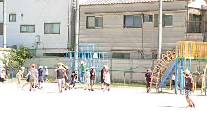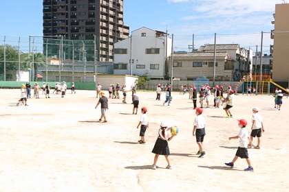 秋晴れの空の下、子どもたちが元気に外遊びをしています。