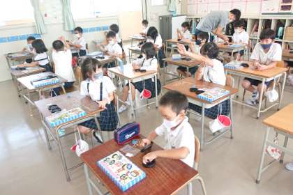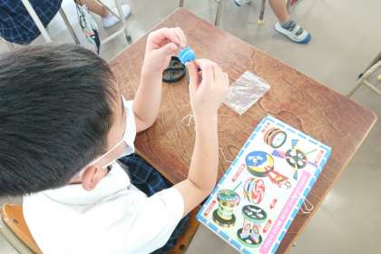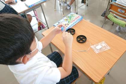 図画工作科の時間は、教材セットを使って、おもちゃづくりをしました。