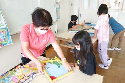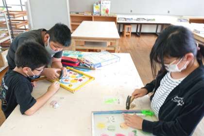 図画工作科の時間には、木材を使ってコリントゲームを作っています。
