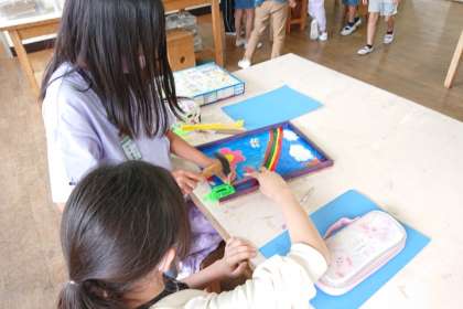 下絵に色をつけ、くぎを打って木枠を作っていきます。