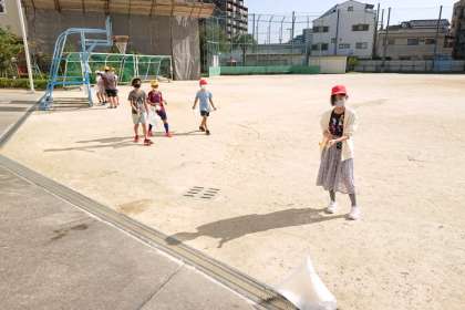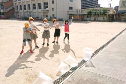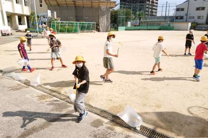 今日は運動場で、水でっぽうを使って水を的に当てる実験をしました。