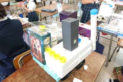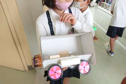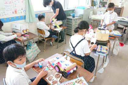 図画工作科の時間は、空き箱やペットボトルなどの廃材を組み合わせて、走るおもちゃを作りました。