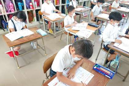 算数科の時間には、教科書の図を見て、どちらが多く水が入るのか考えました。