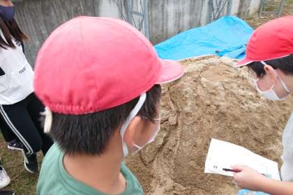 理科の時間には、流れる水にはどんな働きがあるのか、実際に土の山に水を流して調べました。
