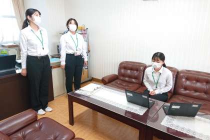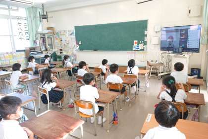 今日の朝会は、各教室と校長室を結んでオンラインで行いました。