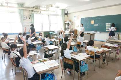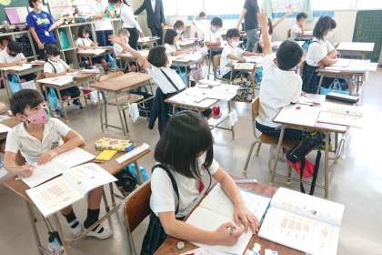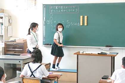 子どもたちは、5の段の九九は、答えが5ずつ増えることに気づきました。