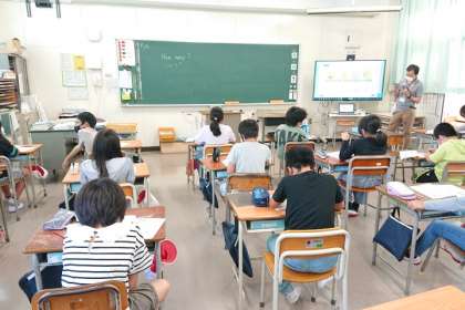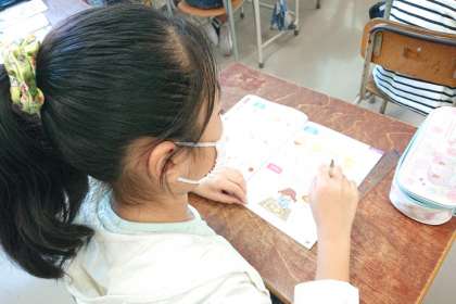 野菜やくだものの名前の英語の言い方を聴いて、教科書の絵と名前を線で結んでいます。