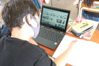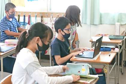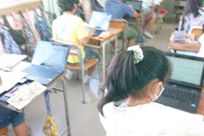 1人1台パソコンで、避難場所や避難ビル、ハザードマップ、災害用伝言ダイヤル、地震が多い地域などのことにちて一人ひとり課題をもって調べています。
