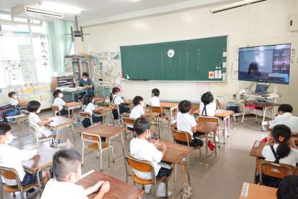 今日の児童朝会は、各教室と校長室をオンラインで結んで行いました。