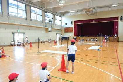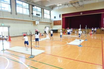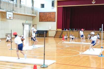ゴムを使って、低いところから少しずつ高くとべるように、ステップをふんで練習しています。
