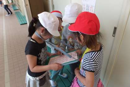 たんけんが終わったあとには、講堂で1,2年全員でじゃんけんれっしゃをして交流しました。