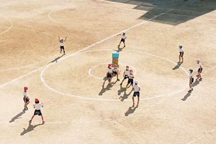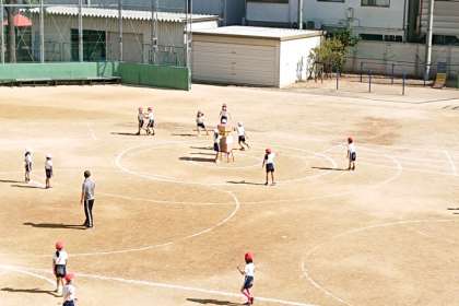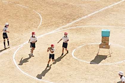 グループに分かれて、円の外からねら箱をねらってボールを投げるチーム、円の内側からボールが箱に当たらないよう守るチームに分かれて、ミニゲームをしました。