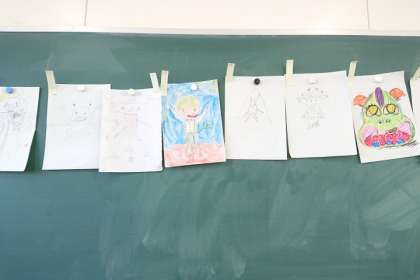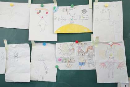 5年生の子どもたちが、謎の宇宙人「ザッケル星人」を想像してイラストを描きました。