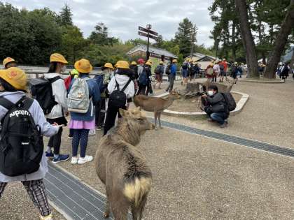 奈良公園では、鹿がお出迎え。