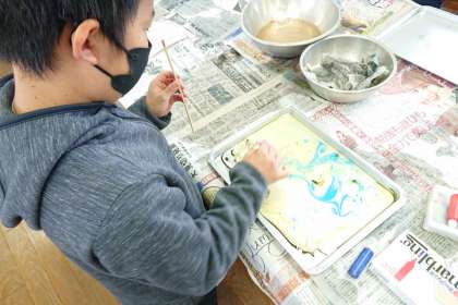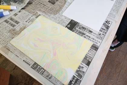 水面に絵の具などを落とし、偶然にできた模様を紙に写しとります。