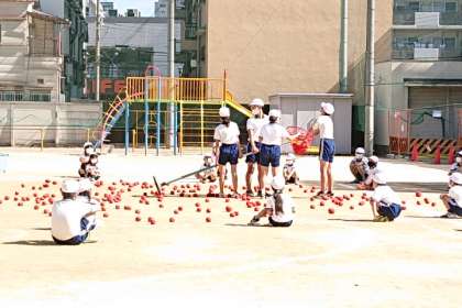 1年生がかごに入れた玉を、6年生が数えます。