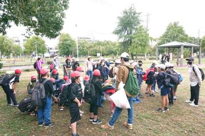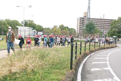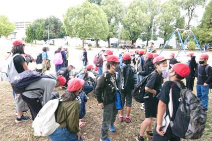 社会科で学習したごみ処理工場の前まで歩いて折り返し、西淀公園に到着し、3年生と合流しました。