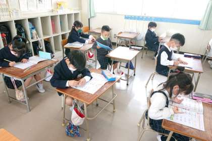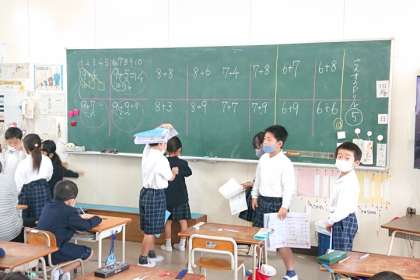 算数科の時間は、9+4、8+8、7+9など、くり上がりのあるたし算の学習をしています。