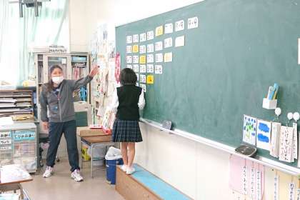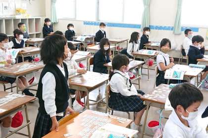 算数科の時間は、たしざんのカードを机の上に並べてみて、どんな並び方になっているのかみんなで考えました。