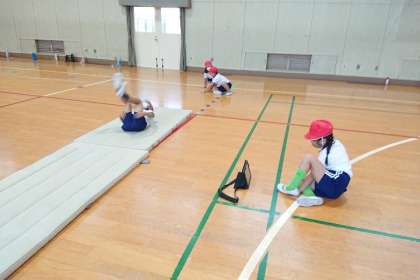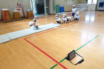 タブレットを使って、自分が回っているようすを撮影し、映像を見てふり返っています。