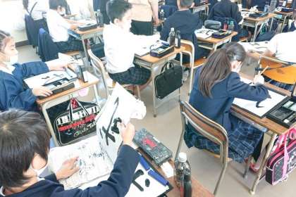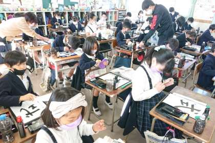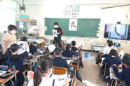 書写の時間は、毛筆で「式」という漢字を練習しました。