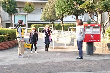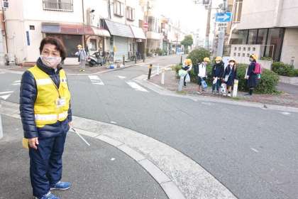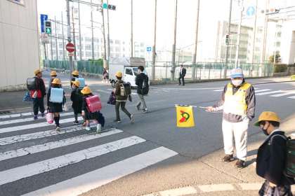 通学路の交差点などに、地域の見守り隊の方や、PTA「Uガード」の方が交代で立っていただいています。
