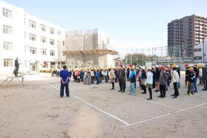 今日の児童朝会は、全校児童が運動場に集まって行いました。