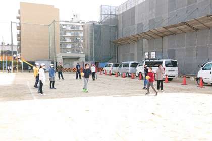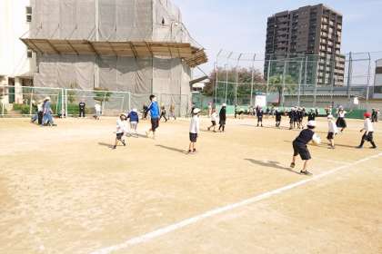 たくさんの子どもたちが外遊びをしています。