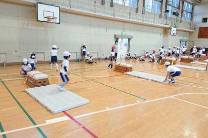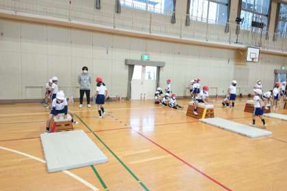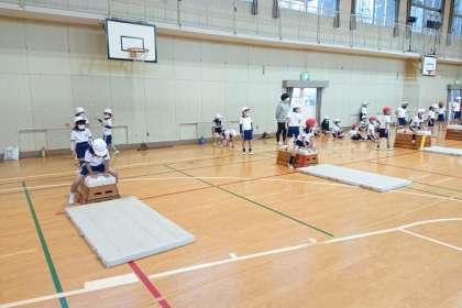 まずは、とび箱の上にのって、とび越す感覚をつかむ練習をしました。