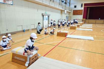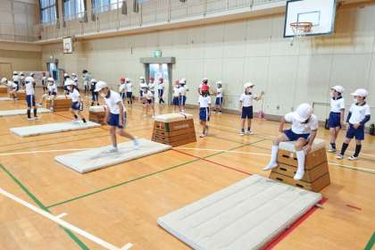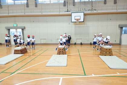 まずは、とび箱の上にのって、とび越す感覚をつかむ練習をしました。