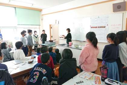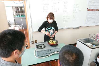 家庭科の時間は、来週の調理実習に向けて、「三色野菜炒め」の作り方について説明を聞いています。