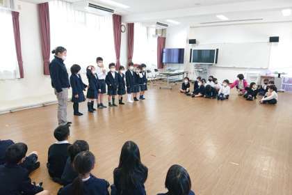 国語科の「サラダでげんき」の音読や、音楽科の「きらきらぼし」の合奏などを組み合わせ、発表の練習をしています。