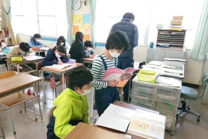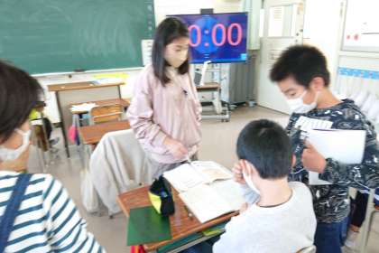 わからないところをお互いに教え合い、協力して学習しています。