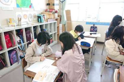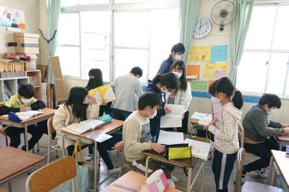 わからないところをお互いに教え合い、協力して学習しています。