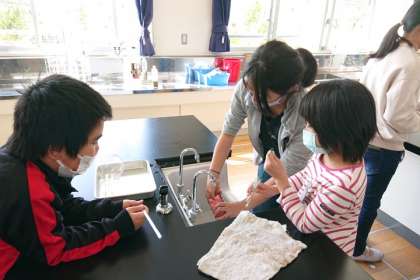説明を聞いた後、フラスコなどのガラス器具を実際に洗ってみました。