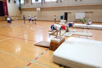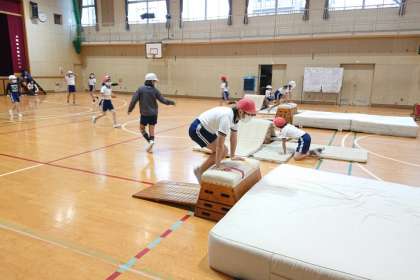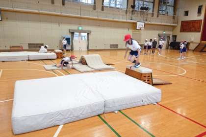 ・踏み切った後は、素早く両ひざを胸に近づけ、体を小さくする。