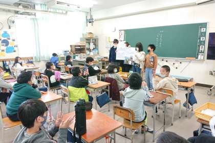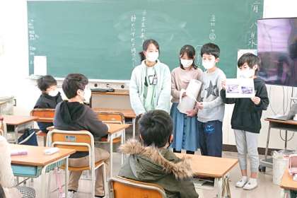 6年生がグループに分かれ、広島への修学旅行で、戦争や原子爆弾の被害などについて学んだことをまとめ、各教室で報告しました。