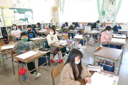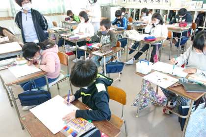 図画工作科の時間は、「なかよくくらす ちきゅうのなかま」をテーマに「エコ絵画コンクール」に出す絵を描きました。
