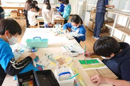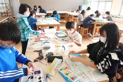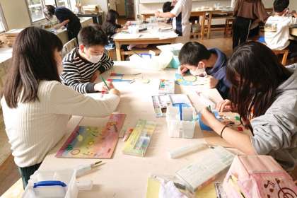 図画工作科の時間は、木の板の材料に着色して、伝言板を作っています。