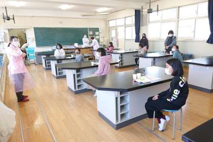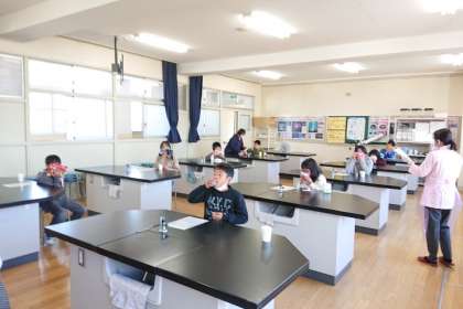 次に、理科室でフッ化物洗口を行いました。